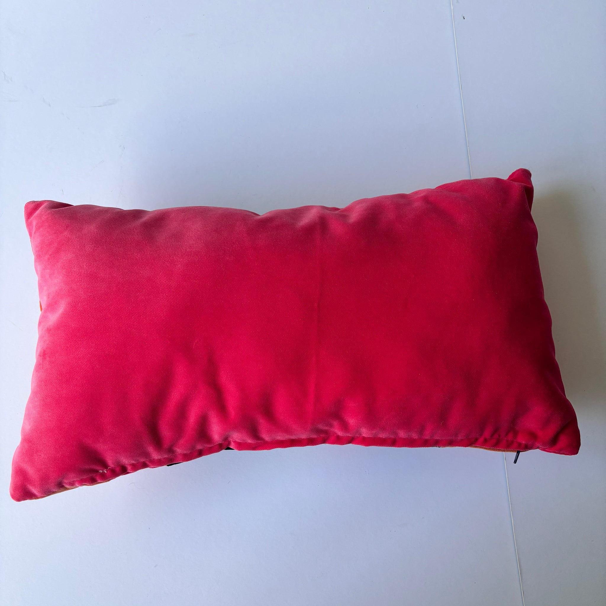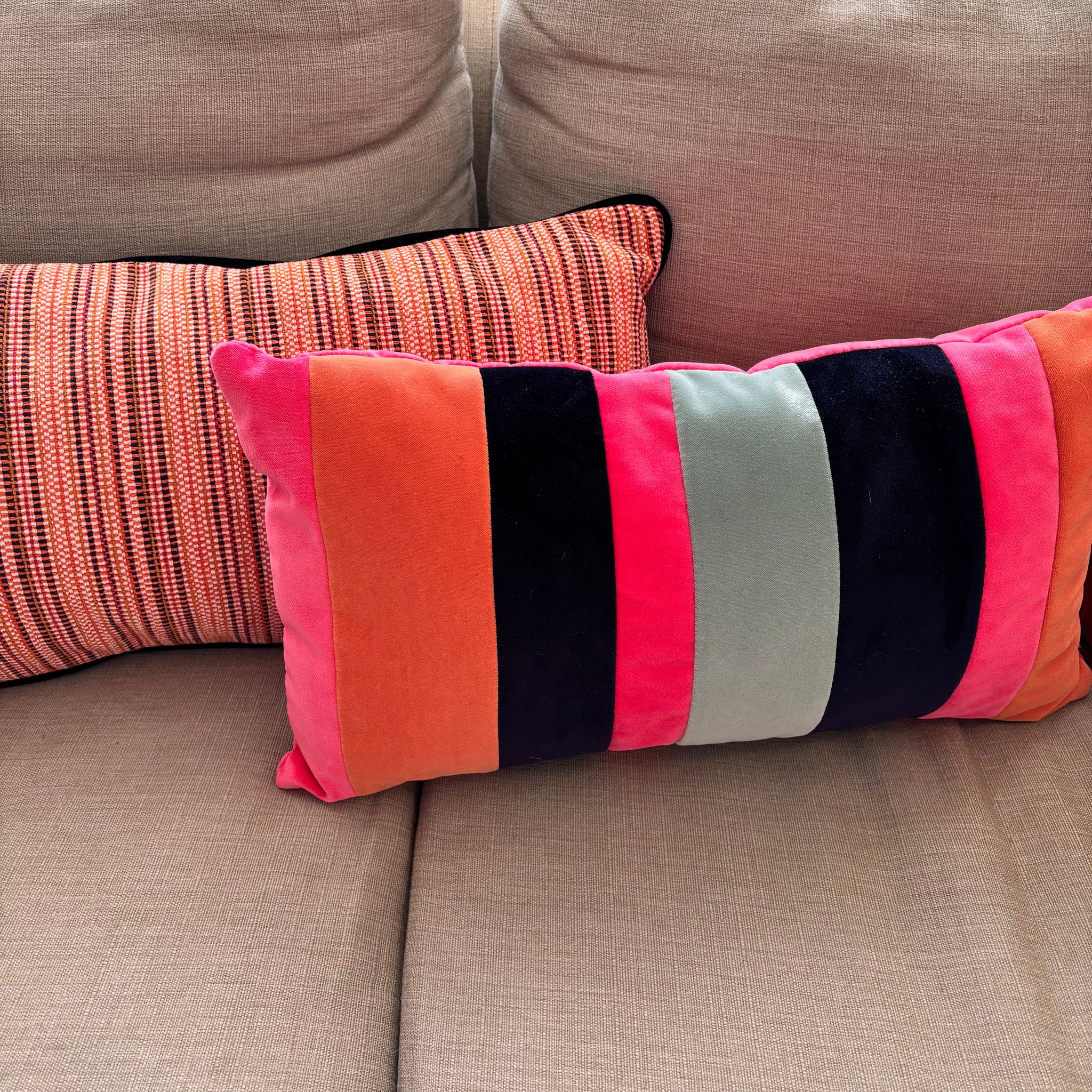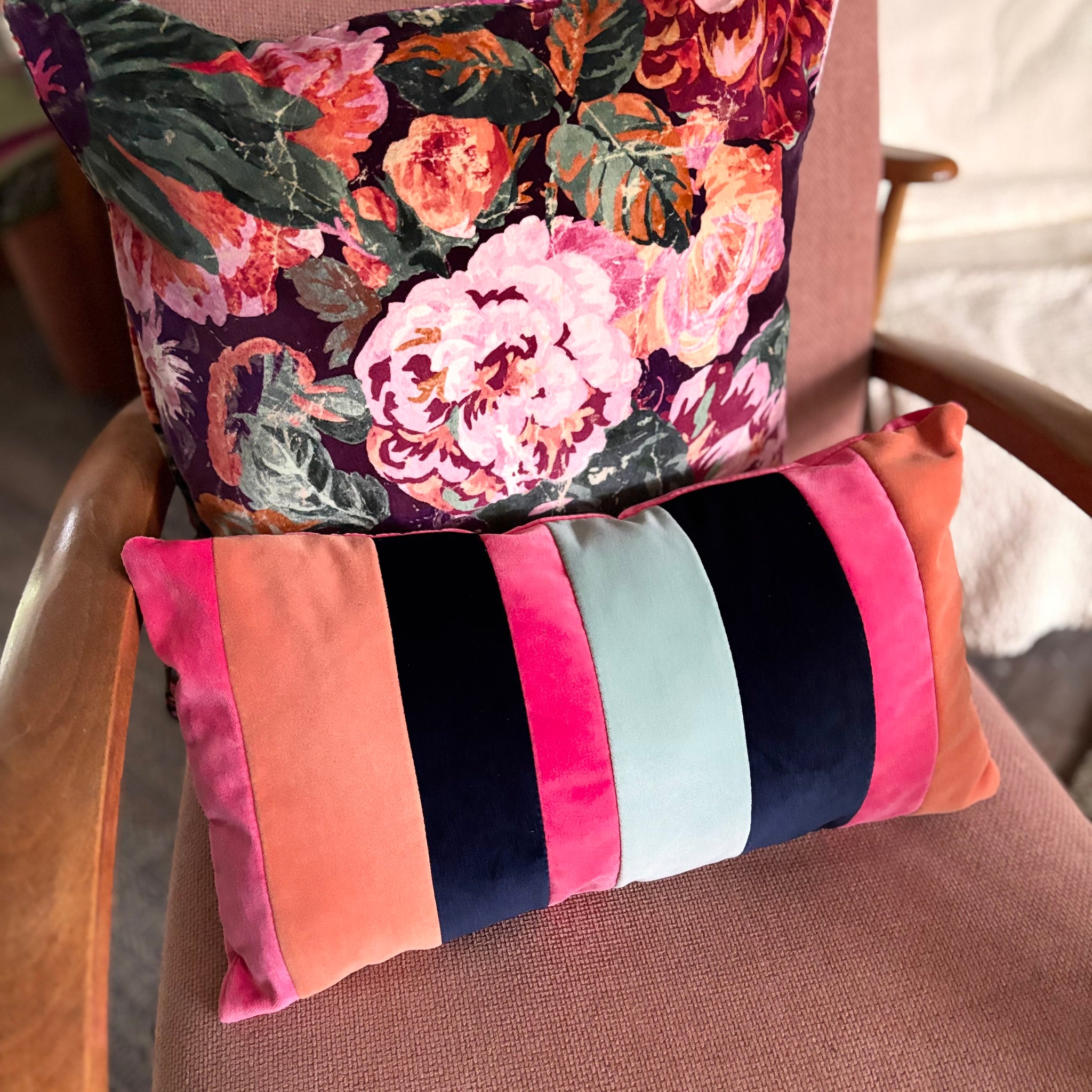Striped Velvet Lumbar Cushion: Pink, Coral & Navy - Handmade